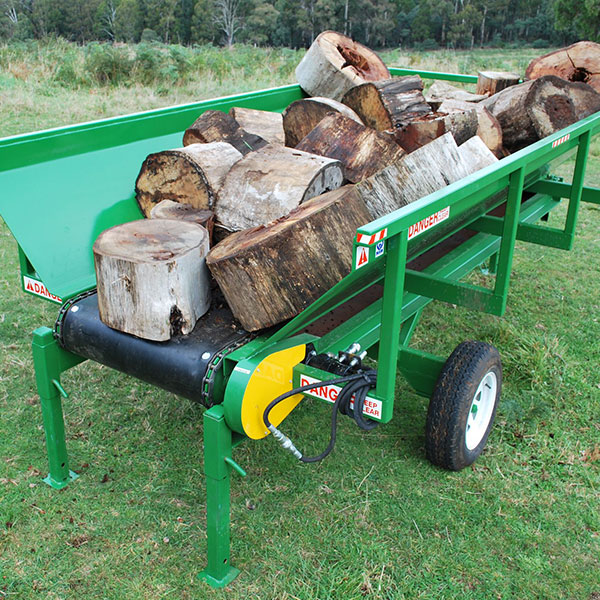 Infeed hoppers have the potential to more than double splitting production by reducing wood handling. The hopper is filled with a loader, which means the operator spends less time away from the splitter. This one cord hopper feeds timber onto the wood splitter bench for splitting, and is powered by the hydraulics on the wood splitter.